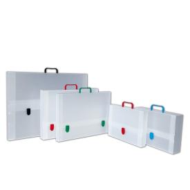 VALIGETTA IN POLIPROPILENE ALVEOLARE NEI COLORI PASTELLO CON MANIGLIA E CHIUSURE BIANCHE.